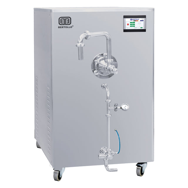 The GNB 300 U is a high-capacity, water-cooled continuous ice cream freezer designed for industrial production. With a 300 L/h output, it features a touchscreen interface for precise control of mix consistency, air incorporation, and defrost cycles. Built with chrome-plated AISI 304 stainless steel, ceramic pump components, and a semi-hermetic compressor, this unit ensures durability and performance.