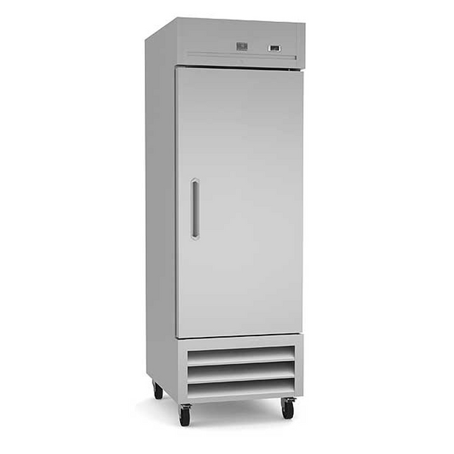 (738244) Reach-in Freezer, one section, self-contained bottom-mount refrigeration, 23 cubic feet capacity, stainless steel reversible door with lock, -4/-9° F temperature range, LED light, (3) vinyl coated steel shelves, 304 stainless steel interior, galvanized & stainless steel exterior, heavy-duty casters, R290 Hydrocarbon refrigerant, 1/2 HP, 115v/60/1-ph, 0.8kW, 8 amps, NEMA 5-15P, cETLus, ETL-Sanitation