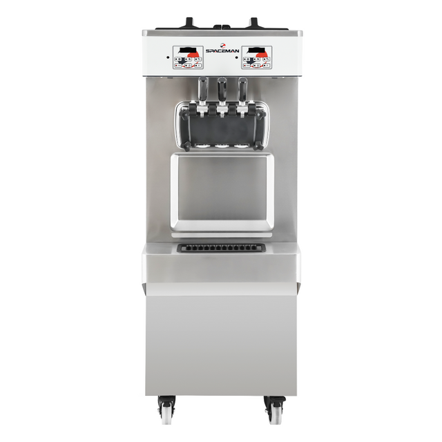 The 6378-C is a high-volume twin twist (two flavors) floor-standing soft serve machine, ideal for locations serving up to 16oz portions. It can produce over 700 small 4oz servings per hour, making it perfect for ice cream, frozen yogurt, custards, and sorbets. Featuring an easy-to-use dual digital interface, it ensures consistent product quality, temperature control, and hopper refrigeration. The 6378-C also includes heavy-duty caster wheels and an 8-foot power cord for easy mobility.