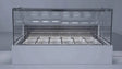 Vitrina con cierre mecánico; cristal superior abrible mediante microbisagras de acero pulido; laterales calefactables con sistema antivaho patentado; plafón de aluminio pulido con carril integrado para guías de plexiglás herméticamente selladas; tira de iluminación LED no spot de 3000°K; deflector frontal de cristal.