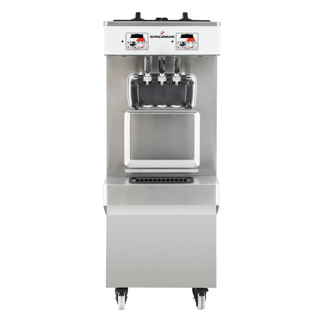 La 6378A-C es una máquina de helado suave de pie, de alto rendimiento y con doble giro (dos sabores), diseñada para establecimientos con gran volumen de ventas, que sirve porciones de hasta 355 ml (12 oz). Gracias a su tecnología de bomba de aire con seis ajustes de sobrealimentación, crea un helado suave más cremoso, esponjoso y ligero, ideal para hacer espirales. Con capacidad para producir más de 700 porciones pequeñas de 113 ml (4 oz) por hora, es compatible con una variedad de productos, como helado, yogur helado, natillas y sorbetes. Sus dos controles digitales mantienen la calidad y la temperatura del producto con precisión, mientras que la refrigeración de la tolva y los agitadores garantizan un enfriamiento uniforme. Sus ruedas giratorias de alta resistencia y un cable de 2,4 metros (8 pies) facilitan su transporte e instalación.