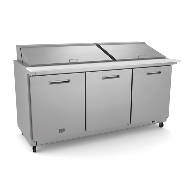 Refrigerated Sandwich/Salad Prep Table, three-section, 71-3/4"W, self-contained rear mounted refrigeration, 18 cu. ft. capacity, accommodates (18) 1/6 GN pans, adapter bars included, (3) solid hinged doors, full depth cutting board, +32/+41°F temperature range, (1) vinyl coated steel shelf per door, 430 stainless steel worktop, insulated lid, external temperature display, electronic temperature control, automatic defrost cooling system, magnetic removable gasket, cabinet insulated with high-density polyurethane, fin & tube condenser, heavy duty casters, heavy duty door hinges, pre-wired heavy duty power cord, R290 Hydrocarbon refrigerant, 115v/60/1-ph, 0.72kW, 4.3 amps, NEMA 5-15P, cETLus, ETL-Sanitation